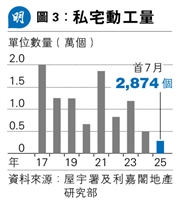截至上半年低,本港仍有2.7萬個住宅貨尾單位,按年增8000個。高庫存影響發展商新開發項目,據利嘉閣數據,去年私人住宅動工量5030伙,為有紀錄以來的23年新低,今年首7個月動工量則為2874伙,按年再跌37%(見圖3)。沈建富稱,目前市場對買樓熱情不高,或要較長時間才能減少庫存,現時起計或再需至少20個月才能降至較健康水平。